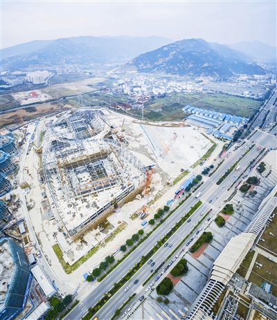 近景为奥体中心一期建设工地,远处中间位置为朱垟村。赵用杨豪摄