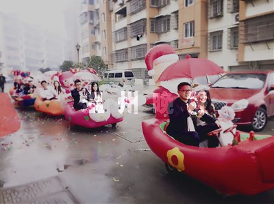 于是,新郎叶灿灿就去和充气车行老板商量,打算租用6辆。刚开始老板也有各种担心,因为这车子动力不足,蓄电能力只有半小时左右,但考虑到这也是喜事,便就答应了。这对新人以6辆车租用费1000元便达成了一致。