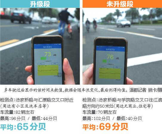现场实验:“升级段”平均噪音65分贝,“未升级段”69分贝