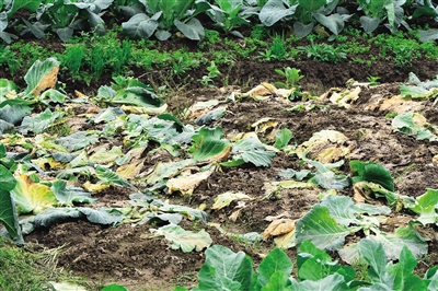 在农户文流彬家的菜园,笔者看到部分花菜根部已经腐烂,他和妻子趁着难得的天晴在给农作物打药。“我们在这里承包了12亩种植花菜,今年雨水太多,菜都长得不好,我家菜地又处低洼,产量至少要损失一半。”文流彬惋惜地说。文流彬的妻子捡起一棵花菜说:“这些菜看上去还绿绿的,其实根部已经烂断停止生长,本来这批花菜再过20来天就可以采摘的。”