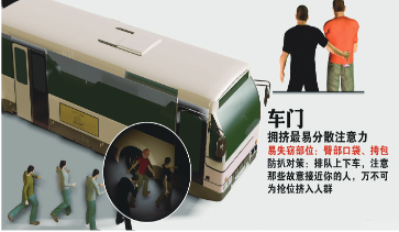 防范要领:上下公交车时要将衣服的纽扣扣好,并将背包放在身前,同时多留心自己随身携带的钱包、手机等物。遇到挡住车门却不上下车的可疑人员,应同时对身边的其他人加以警觉。