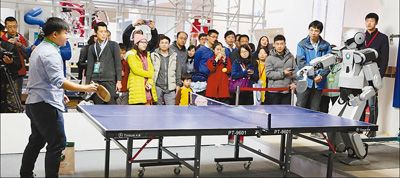 参观者在2015世界机器人大会上与机器人打乒乓球。