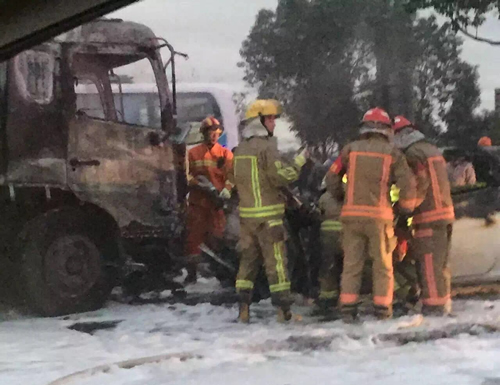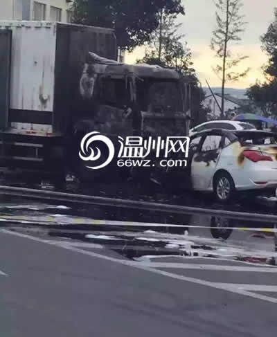 温州网记者赶到现场时发现,现场已拉起了警戒线,可以看到两车的车头前部均已烧焦,小轿车焚毁严重,基本上烧的只剩下一个框架了,快递车也遭到了很大程度的烧毁,路面上散落着不少烧焦的快递包裹。