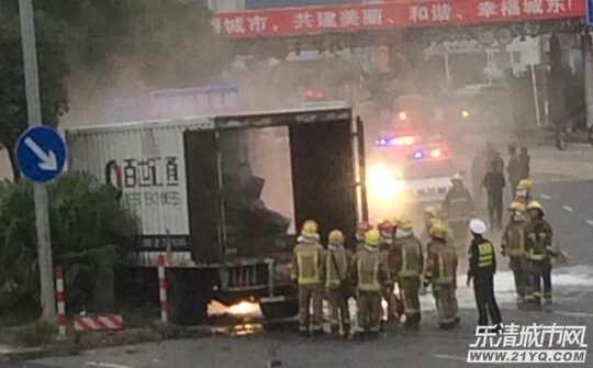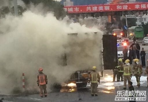 温州网11月25日讯(记者项锐)今天早上,在乐清104国道原收费站路口前,一辆百世汇通快递车与一辆白色的私家轿车相撞后起火。