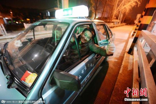 资料图:图为2月17日,江苏省扬州市,一名司机正在开心的展示刚刚领到了临时通行卡。孟德龙摄