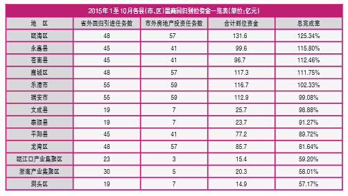记者了解到,浙南产业集聚区的签约项目落地率、落地速度保持在全市前列,新落地项目开工率也连续两年保持100%。今年浙南产业集聚区的建设项目进展都较为顺利,那为何今年温商回归到位资金完成率却不高?