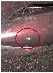 什么,车被刮了?胡先生坦言,他在开车门时,根本没有发现车被刮的痕迹,于是他重新下车,找纸条上提到的这个“圆点”。胡先生的车为暗红色,他仔细观察了车身,才发现驾驶门车把上,确实有一个小拇指指甲大小的白色圆点。