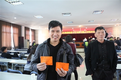 今年9月,主体工程结顶通过预验收,目前正在完成附属工程的配套工作,预计明年5月交付使用。图为村民阮宝益开心地向大家展示他的两个幸运号。