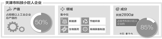 截至今年9月底,天津全市科技型中小企业总数达到71190家,其中小巨人企业累计达3406家。天津全市规模以上工业企业中,科技小巨人企业数量占33%,工业产值却占据总产值的半壁江山。70%的科技型中小企业、85%的科技小巨人企业,集中在新能源、生物医药、节能环保、高端装备制造等战略性新兴产业领域,专利申请量年均增长30%以上,成为带动天津经济转型、产业升级的生力军。其中,民营企业占全市科技型中小企业总数的比重提高到95%,经济总量比重超过90%。