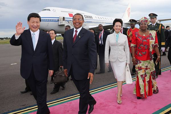 图为2013年3月24日,国家主席习近平乘专机抵达达累斯萨拉姆尼雷尔国际机场,开始对坦桑尼亚进行国事访问。坦桑尼亚总统基奎特和夫人到机场迎接习近平和夫人彭丽媛。(新华社记者兰红光摄)