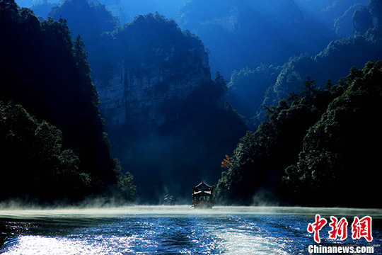 蓝天下的湖南张家界宝峰湖风景区,薄雾在湖面飘绕。中新社记者吴勇兵摄