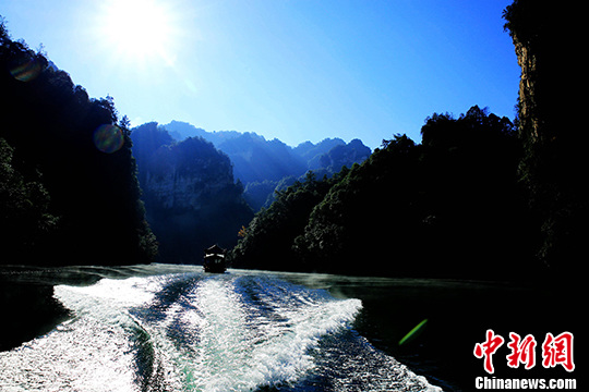 12月7日,蓝天下的湖南张家界宝峰湖风景区,薄雾在湖面飘绕,船行其中,宛如一幅水墨丹青画卷。中新社记者吴勇兵摄