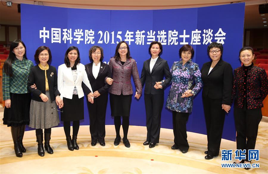 12月7日,新当选的女院士合影留念。2015年新当选院士中有9名女性,数量和比例均为20世纪90年代规范院士增选制度以来最多的一次。当日,中国科学院公布2015年院士增选结果,增选61名中国科学院院士和12名外籍院士。同日在中科院学术会堂举行新当选院士座谈会,新当选的院士签署承诺书,并获颁院士证书。新华社记者金立旺摄