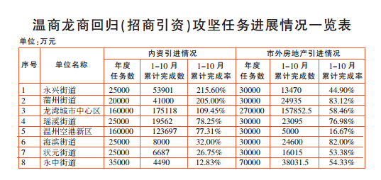 虽然我区“招商引资”工作取得了一定的成绩,但从细处着眼,各街道以及功能区的进度并没有看上去那么“美”,相互之间仍存在不小的差距。其中,1—10月份,永兴街道、蒲州街道、龙湾城市中心区均已超额完成内资任务。值得一提的是,永兴街道、蒲州街道完成率远远高于其他街道和功能区,分别达到215.6%和205%,可谓是“招商引资”攻坚工作中的“模范生”。另外,在市外房地产引进方面,永兴和蒲州也非常亮眼,合计到位资金总完成率分别为122.49%和131.87%。
