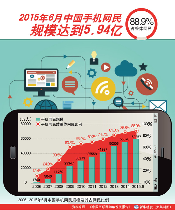 图表:2015年6月中国手机网民规模达到5.94亿新华社发大巢制图