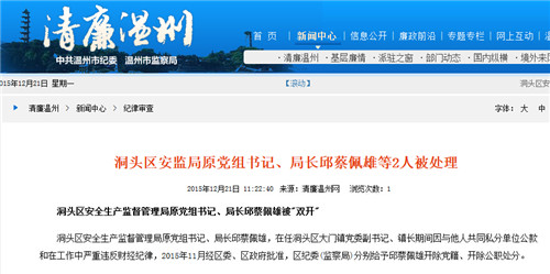 温州网12月21日讯(记者诸葛之伊)据温州市纪委官方网站“清廉温州”消息:洞头区安全生产监督管理局原党组书记、局长邱蔡佩雄,在任洞头区大门镇党委副书记、镇长期间因与他人共同私分单位公款和在工作中严重违反财经纪律,2015年11月经区委、区政府批准,区纪委(监察局)分别给予邱蔡佩雄开除党籍、开除公职处分。