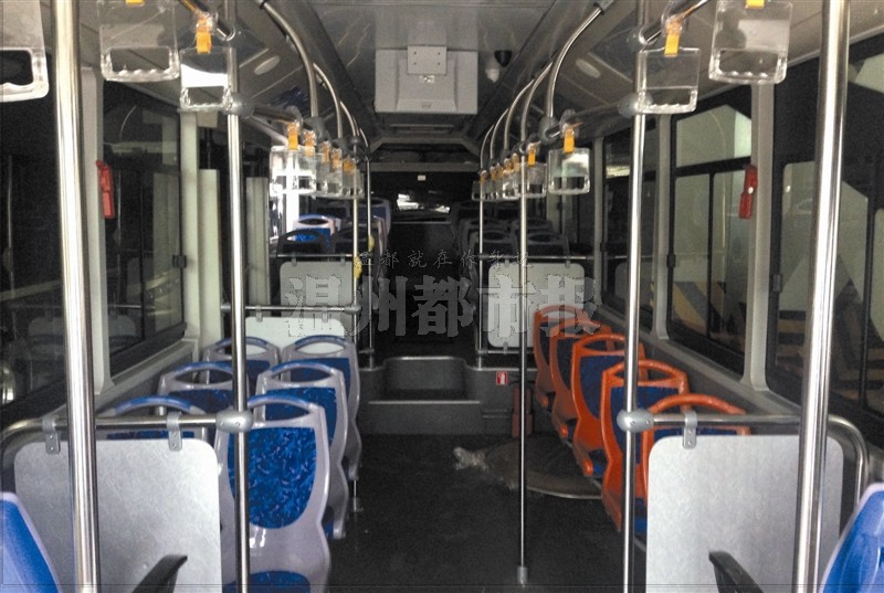 进入车厢后记者发现,12米的车总共有33个座位,座椅以蓝色为主,车厢后侧的座位布局与普通公交类似,两侧均设有两个并排的座椅。而车厢内部前侧则略有不同,仅在靠车门一侧设置了6个并排座椅,另一侧则只设置了5个照顾专座,颜色为橙色。