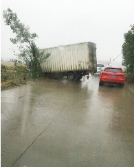 昨日14时15分许,天空下着大雨,记者来到现场时,看到一辆小货车正侧翻在农田里,一名中年男子站在公路边打电话求助。