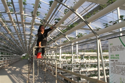 龙湾新闻网讯(王策 谢雪来)日前,龙湾雅林水培园中草莓开始花芽分化了。为了延迟草莓结果时间,员工们精心地修枝、摘花芽及维控温度等,力求在春节期间让广大观光者大饱口福。据了解,该园中5万多株草莓都采用了立体无土基质栽培技术。这也是我市第一家水土栽培草莓的试验场,也是全国大规模水培草莓第一家。农技师杨杨告诉记者,无土栽培使用电解功能水,具有高效杀菌能力、无残留、无污染、使用操作简便等特点,在设施农业应用上是一种安全、高产、高效的种植新技术,具有非常广阔的应用前景,对发展可持续农业和保护生态环境具有开创性意义。图为农技员在修枝、去草莓匍匐茎。