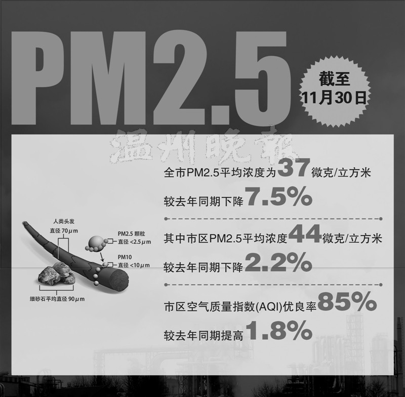 根据报告内容,截至11月30日,全市PM2.5平均浓度为37微克/立方米,较去年同期下降7.5%,其中市区PM2.5平均浓度44微克/立方米,较去年同期下降2.2%,市区空气质量指数(AQI)优良率85%,较去年同期提高1.8%。