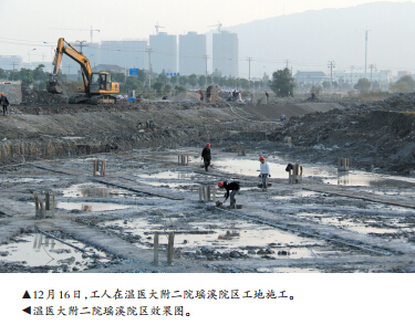 记者在施工现场看到,三台挖掘机在开挖土方,已经挖了约2米。温医大附二院副院长应斌宇介绍,该工程于去年10月正式开工,工期53个月。今年5月完成桩基施工,11月完成主体工程招投标。