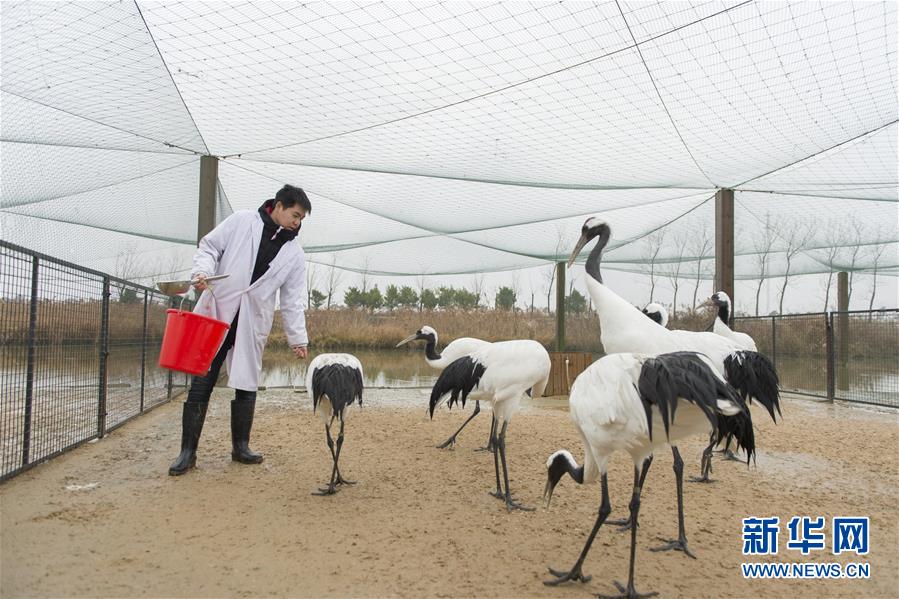 12月23日,保护区的驯养救治人员潘成功在喂养丹顶鹤。为了不惊扰到来此越冬的野生丹顶鹤,保护区人工驯养了一批丹顶鹤供游人观赏。新华社记者李响摄