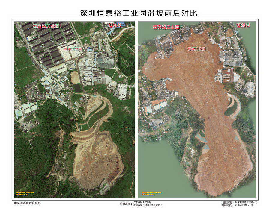 据了解,12月21日上午10点,国家测绘地理信息局制作出灾前0.5米滑坡影像图、标注滑坡位置的地形图、并提供国务院应急办、国土资源部等使用。下午3时,深圳市规划和国土资源委员会组织相关公司完成航空摄影,获取到事发地现场0.15米分辨率影像,于晚8时将全部灾后影像数据传至国家基础地理信息中心。中心技术人员加班加点,赶制完成滑坡前后影像对比图,提供给国务院应急办。通过对比,可以清晰地看出滑坡区范围、界线等,直观了解房屋、道路等基础设施和植被受损情况,为研判灾情、科学救灾提供了及时的地理信息数据支持。