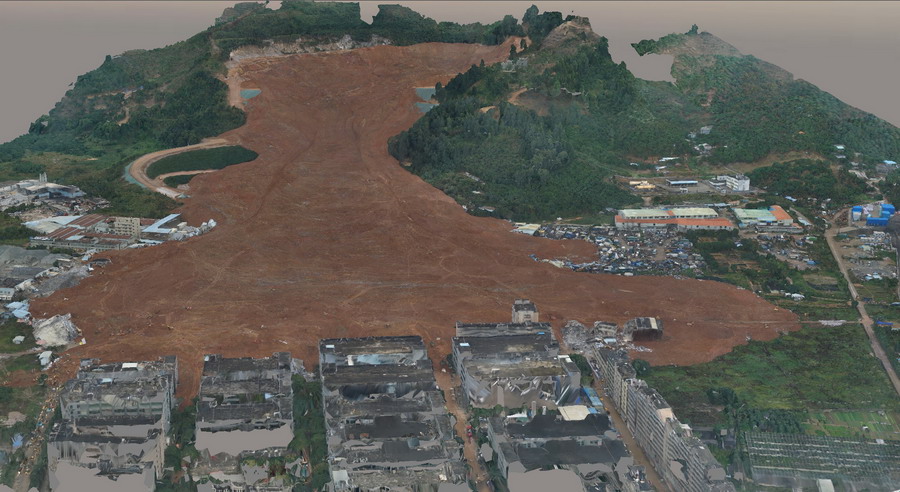 此外,国家测绘地理信息局还协调地理信息企业积极行动,充分发挥技术优势,全力投入到抢险救灾中。北京红鹏天绘科技有限公司于灾情发生后的当天深夜赶到现场,利用无人机进行夜间航拍,为救灾指挥部提供了第一手灾区视频资料。第二天,携带倾斜摄影相机的无人机又先后起降5个架次,及时获取了灾区高分辨率影像,随后迅速生成三维立体模型,灾区全貌一览无余、清晰可见,各个角度都能迅速灵活地进行切换、移动,每一棵树、每一栋房屋、在现场紧张作业的挖掘机,甚至连滑坡的细微裂纹都清晰可见。这一实景模型为制定救援方案以及防治次生灾害提供了极大便利。12月21日,上海航遥信息技术有限公司等单位使用先进的五镜头无人机倾斜摄影系统对受灾现场进行了航空摄影,获取2300余张照片,国家基础地理信息中心根据这些资料第一时间计算出相关灾情数据,目前,相关资料已报送国务院应急办。