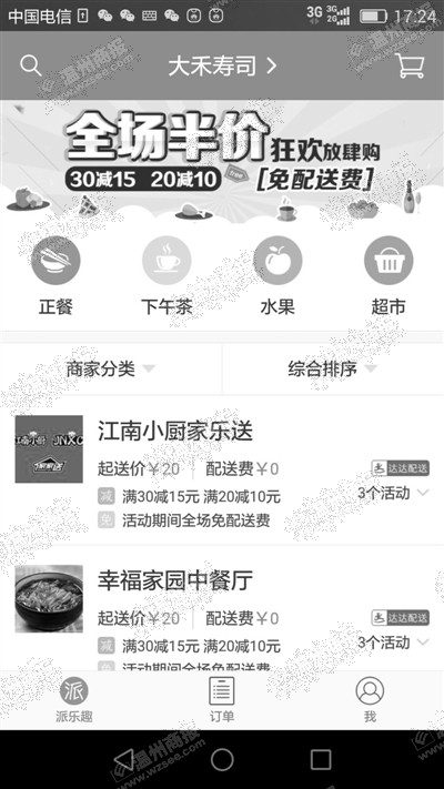 前天,记者下载了这个名为“派乐趣”的点餐APP,页面上显著标注“满30减15,满20减20元”、“活动期间全场免配送费”。入驻商家分“正餐”、“下午茶”、“水果”、“超市”四大类,具体配送单位为“达达配送”。