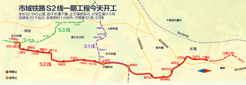 S2线一期工程全长62.945公里,起于乐清城东街道下塘,止于瑞安市东山街道,计划总工期4.5年。