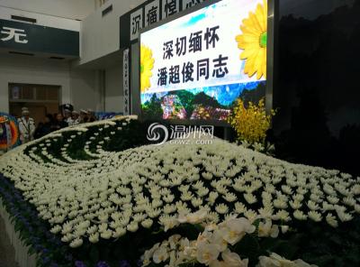 满桌的白花,表达了对潘超俊的深深思念之情。7点31分,潘超俊同志遗体告别仪式正式开始。
