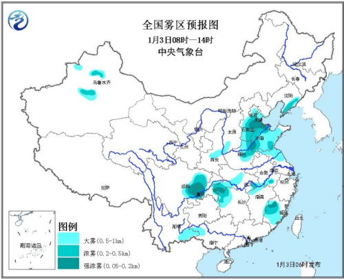 中央气象台1月3日06时继续发布大雾橙色预警: