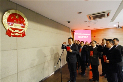 龙湾新闻网讯(陈出 希赛 卉卉)“我宣誓:忠于中华人民共和国宪法,维护宪法权威,履行法定职责……为建设富强、民主、文明、和谐的社会主义国家努力奋斗!”2015年12月30日,在区人大常委会第29次会议的会场上,10名新任命干部向宪法郑重宣誓。据悉,这是区人大常委会首次实行任命干部向宪法宣誓活动,也标志着宪法宣誓制度在我区正式实施,并成为常态化制度。区人大常委会主任周赞参加仪式。
