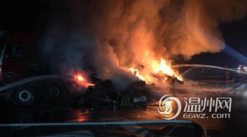 温州高速交警四大队民警赶到现场时,半挂车的货物已经全部烧着,现场浓烟滚滚,由于装载了满车的皮革原材料、皮革制品、白酒及其他百货用品,大多属于易燃物品,不时传出噼里啪啦的声响,大火越烧越旺,许多货物边烧边掉落到地面,把高速公路地面标志标线全部烧焦。