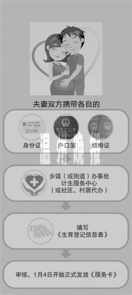办理程序很简单,夫妻双方携带各自的身份证、户口簿、结婚证,去乡镇(或街道)办事处计生服务中心,填写一张《生育登记信息表》就行了,社区和村居也可以代办发放《服务卡》。只要证件齐全,经计生服务部门核实情况属实之后,《服务卡》当即可以办下来。