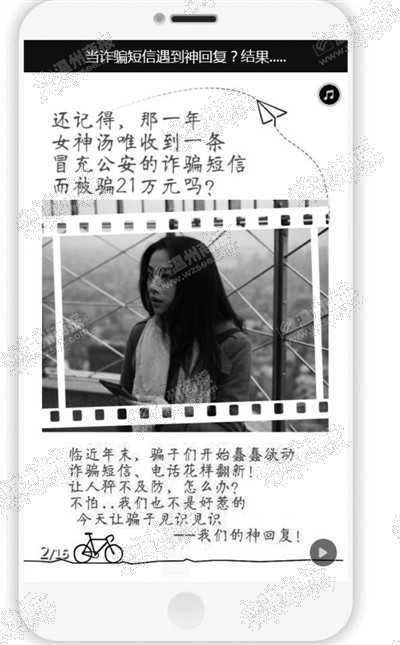 温州网讯还记得,女神汤唯收到一条诈骗短信而损失21万元的事吗?邮包没签收、银行卡被转账、儿子开房被抓……如今面对各种诈骗短信的左右轰炸,市民该如何避免被炸中。昨天,温州市反诈骗中心制作的《跟着蜀黍一起玩转骗子》创意宣传片刷爆微信朋友圈。