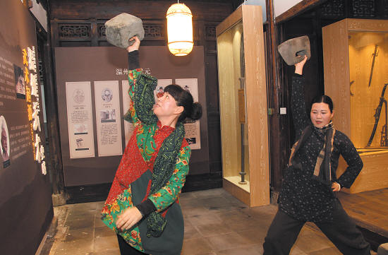 图为市武协义工团的两名成员展示习武时使用的石锁。
