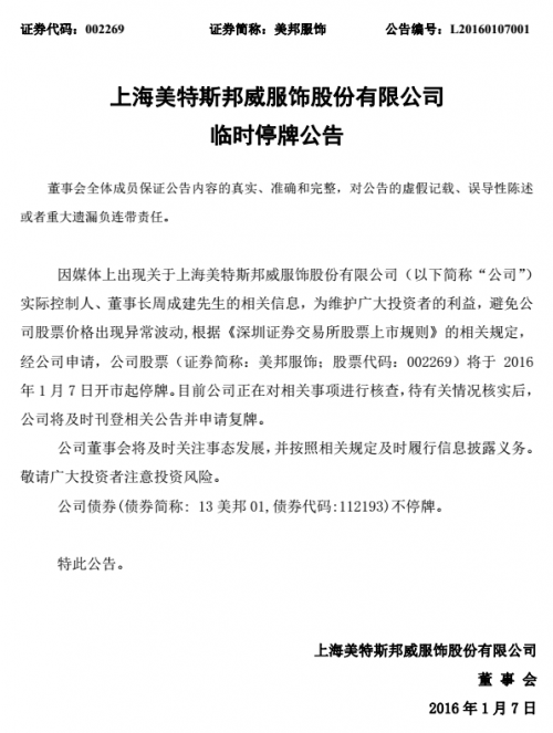 7日一早,美邦服饰宣布临停。公司称,因媒体上出现关于公司实际控制人、董事长周成建先生的相关信息,为维护广大投资者的利益,避免公司股票价格出现异常波动,公司股票将于2016年1月7日开市起停牌。目前公司正在对相关事项进行核查,待有关情况核实后,公司将及时刊登相关公告并申请复牌。公司董事会将及时关注事态发展,并按照相关规定及时履行信息披露义务。