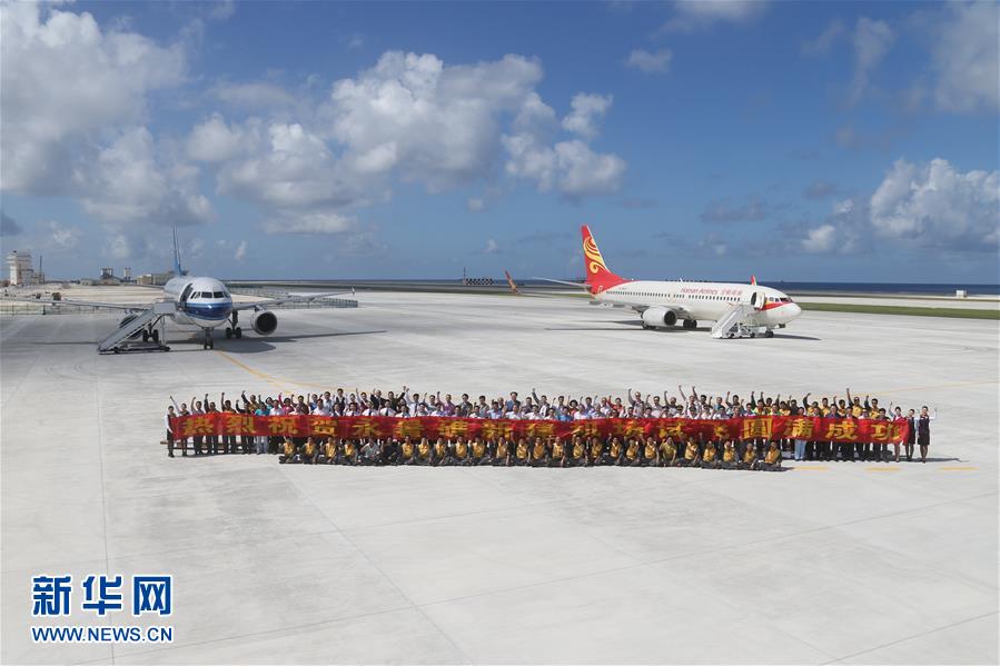 1月6日,两架民航客机降落南沙永暑礁新建机场。这是相关人员合影留念。当日,中国政府征用的两架民航客机先后从海口美兰机场起飞,经过近2小时的飞行于10时21分、10时46分平稳降落南沙永暑礁新建机场并于当日下午返回海口,试飞成功。永暑礁新建机场位于我国南沙永暑礁上,是我国目前最南端的一座机场。新华社记者邢广利摄