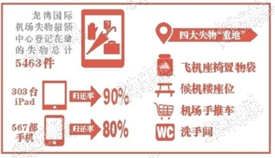 据统计,去年龙湾国际机场失物招领中心登记在册的失物总计5463件,平均每天都能捡到15件失物,归还率约为70%。其中,包括钱包、手机、电脑等在内的贵重物品1168件,归还率约88%。