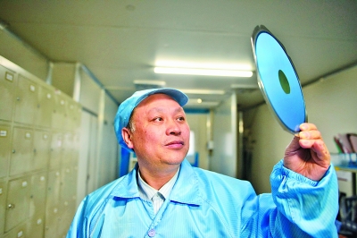 江风益在观察一张硅衬底蓝光LED芯片。新华社记者周密摄