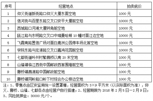 春节市区燃放烟花爆竹具体规定还未下发,目前鹿城、龙湾、瓯海、经开区的公开拍卖烟花爆竹季节性销售点零售经营权的工作均已进入报名阶段,其中鹿城区的拍卖公告显示经营期限为2016年2月5日~2月9日。