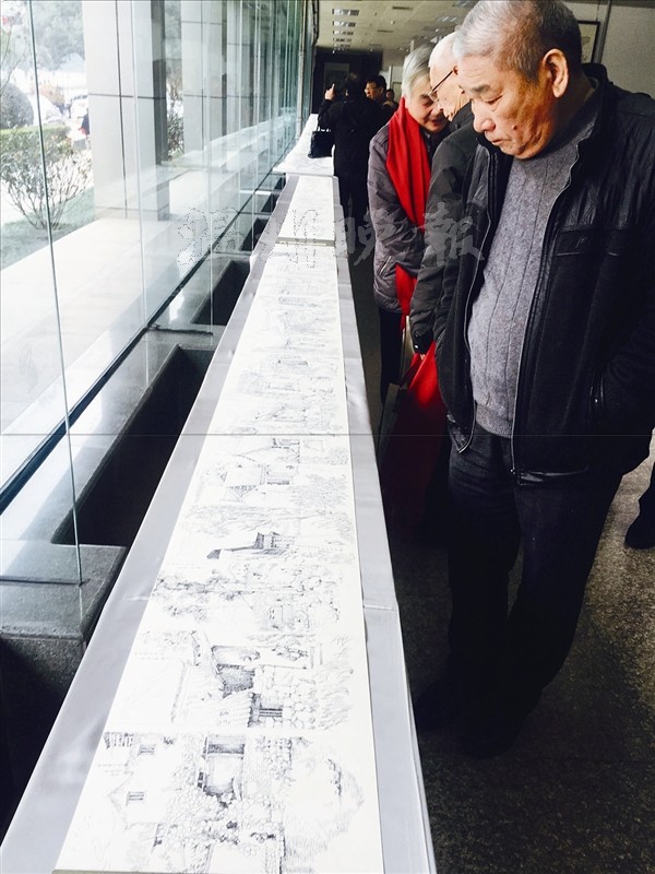 说起王珠润用画笔记录下了永嘉场的地域历史人文风采和山海气象,缘于城市化进程的加快,一座座古民居在推土机下消失,他觉得非常遗憾,便走遍了永昌堡的每个角落,花了两年半的时间画出一段被遗忘的时光,用钢笔把永昌堡画下来(描绘的景点中有许多已是鲜为人知),由此,《永昌堡系列画作》诞生了。他热爱大自然,醉心于山水艺术,大罗山峰峦竞秀,风景绮丽,使其作品再现沉雄秀美的景象。特别是《罗东揽胜》(右上图)的长卷素描,似有《富春山居图》和《清明上河图》之遗风,其意境开阔,气韵生动,由景入情,别开生面,颇耐人寻味。