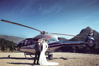 随着螺旋桨的加速旋转,周边刮起一阵炫目的“巨风”,一架银灰色与蓝色相间的直升机摆动着身体盘旋而上,机舱内一对身着婚纱礼服的新人向地面亲友挥手致意……日前,市民郑先生租来一辆直升机在永嘉书院拍摄空中婚纱照。据了解,这是温州市兴龙通用航空有限公司和温州鼎牛文化传媒有限公司首次向温州市场推出空中婚拍业务。