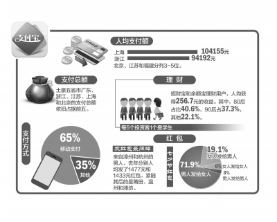 支付宝消费账单显示,2015年人均支付金额增长迅速,上海首先迈入“10万”时代,伴随移动支付的流畅体验,国民生活方式也正经历全面升级,在饮食、出行、消费、理财、旅游等各个方面,变化日新月异:学生理财族正式崛起;沉睡多年的农村理财市场被互联网金融唤醒;即便来自小城,出境游消费力也惊人;除此之外,支付宝更是成为人与人沟通的重要平台,让家人和朋友联系更加紧密。(记者施志军制图吴尚楠)