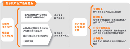 据介绍,我市现有生产性服务业的支撑性项目12个,总投资73.82亿元,去年已完成投资20.14亿元。其中,温州保税物流中心(B型)、温州现代冷链物流中心为省重大服务业项目,也是我市现代物流业重点项目;而中国(温州)国际激光与光电产业联合研究院工程、温州生物材料与工程研究所和北航研究院均位于温州高新技术开发区,建成后将分别入驻一批现代物流、科技研发、信息服务、电子商务等行业的优质企业,形成温州生产性服务业发展的核心区块。