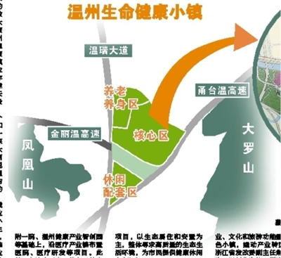 温州生命健康小镇位于瓯海区南白象街道、茶山街道辖区内,南依甬台温高速和大罗山景区,西靠温瑞大道,北临高教园区北入口道路,规划面积3.5平方公里,按“核心区(健康之芯)、养生养老区、休闲配套区”三大功能设计。