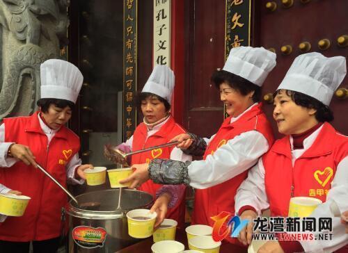 龙湾新闻网讯(李希赛)1月17日上午,温州孔庙在继承传统的基础上,融合南、北方腊八粥选料的不同习俗,增至22种配料精心熬制,向社区群众派送1500份腊八粥。据了解,腊月初五起,温州孔庙就为熬制腊八粥开始准备了,对配料、泡料、熬制等每一道工序都极为考究,精选糯米、粳米、桂圆等22种配料,尤其选用易于冬季补气的北沙参、枸杞等中药材,配上山泉水,分别熬制好每一种配料后,再放一起炖煮。“前一天两点就开始做了,整整煮了一夜,才有今早这香甜的腊八粥。” 温州孔庙负责人孔令仁笑着说。