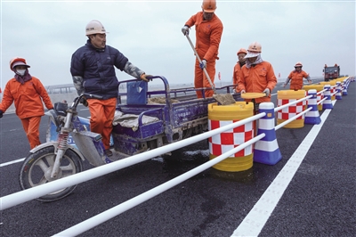 沿路,记者还看到一些工人正冒着寒风在为通车做最后的准备。据了解,考虑到刚刚通车,市民对延伸段道路还不熟悉,因此在这段时间里,延伸段主线限速60公里/小时,匝道限速40公里/小时,同时大货车等重型车辆不得行驶。需要提醒的是,延伸线路段有流动抓拍车在路面巡逻,违规车辆将被处罚。“市民朋友切记慢行,留意沿线标牌、标线的引导,毕竟一些配套设施还没有到位,比如路灯需要到今年的三四月份才能架设完毕,目前只能以紧急照明设备来代替,另外安全隔离设施也在逐步完备中。”李俊雄说。