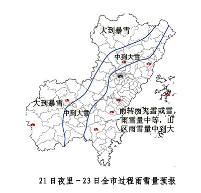 据省气象台预计,北方强冷气团前锋将于21日影响我省,23日开始强冷空气主力大举南下,气温大幅下降,一直持续到25日前后,日平均气温过程降温幅度10~12℃。27日开始气温逐渐回升。预计今明两天有大范围大雪暴雪天气,24日至26日将出现极端低温,部分地区最低气温可能接近或突破历史极值,有严重雨雪冰冻,为罕见强寒潮天气。